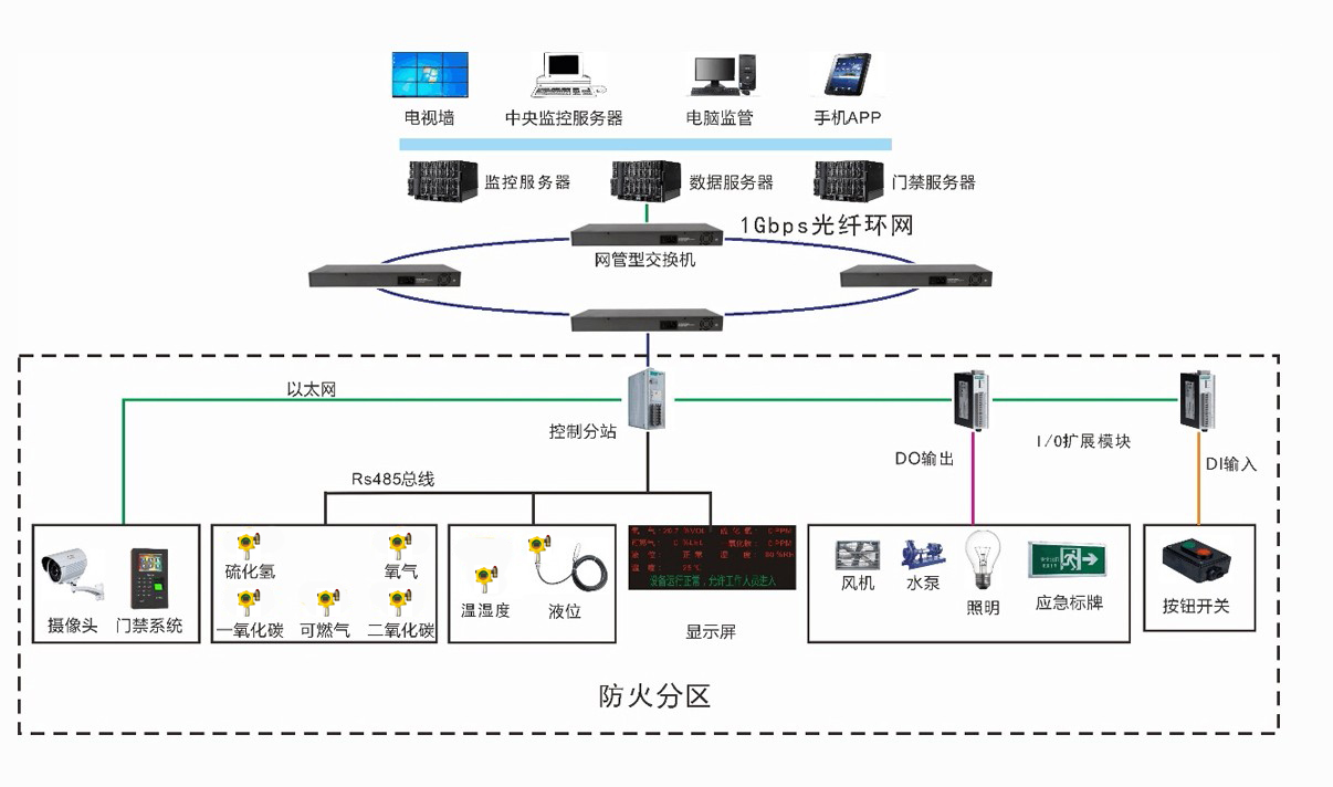 采集系统:控制器通过采集气体探测器、温湿度仪表、液位仪表等,经过CPU逻辑运算,按照设定参数自动对外设进行控制,并且将采集到的数据主动上传到数据服务器,达到实时同步,并驱动LED显示屏,实时显示该区域环境参数,及时提醒是否适合人员进入该场所。