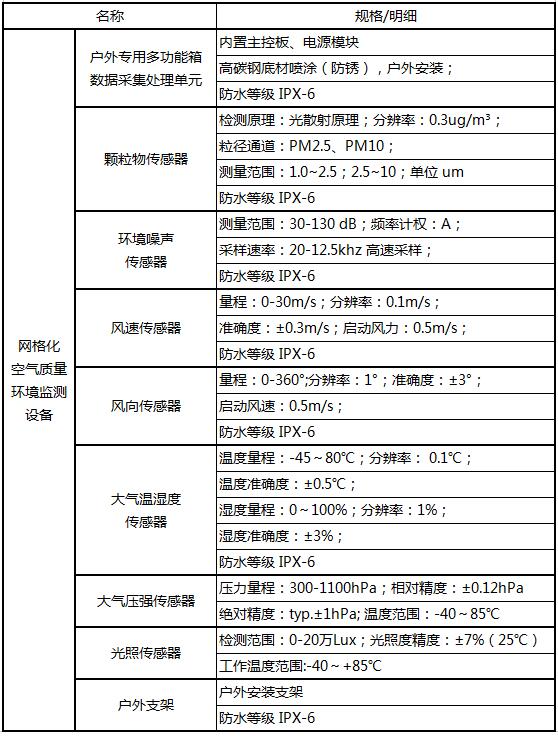 (1)感知层智能监测设备:现场端各类智能监测感知设备,对环境要素进行全面智能感知,前端设备包含主要设备、辅助设备。主要设备指各类检测仪器(PM2.5、PM10、空气温湿度、风速风向、气压、噪声、光照强度)和数据采集主控设备,负责检测各类数据和上传数据;辅助设备主要包括安装仪器设备所需要的安装固定装置等。