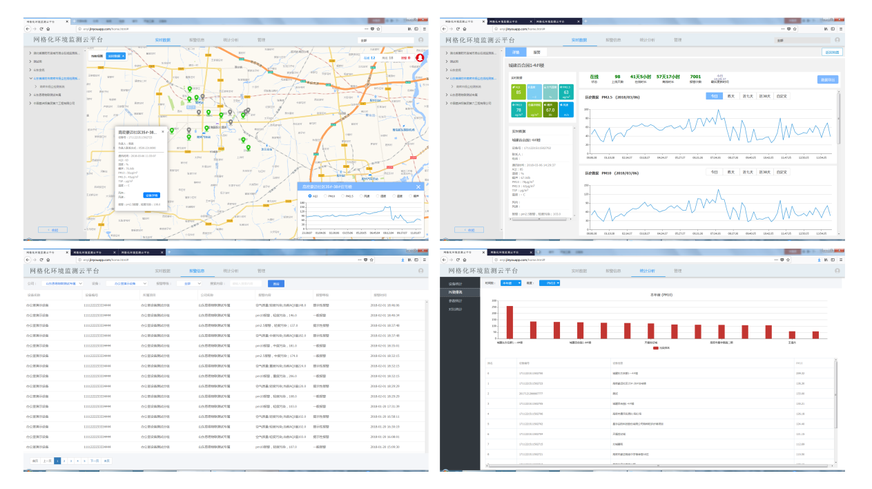 实时数据是根据网格化标准对设备进行分组查看,可直观展示在不同监测参数时的所有点位布设监测总览图及设备在地图上的位置,并通过颜色的变化展示设备状态,并能根据等级图例直观观察污染的程度,查看各参数实时曲线变化图;报警信息模块分为首页报警信息提醒、单台设备的报警信息列表和报警信息历史查询三部分,通过多途径对超标设备信息进行实时提醒记录,以供后期处理和追溯;统计分析模块采用云计算与数理统计分析相结合的方法,又细分为设备统计、污染排名、参数统计和对比统计四部分,主要是对区域内设备状态的实时统计、不同时间段和监测参数的污染排名、设备各项参数的极值统计查询、不同监测因子的对比分析等;单台设备展示模块不仅展示设备的实时数据及详细信息,并且可数图结合,以曲线图展示历史数据和趋势走向,并且曲线图可导出到Excel表格中,自动计算最大值、最小值、平均值,极大方便分析管理。