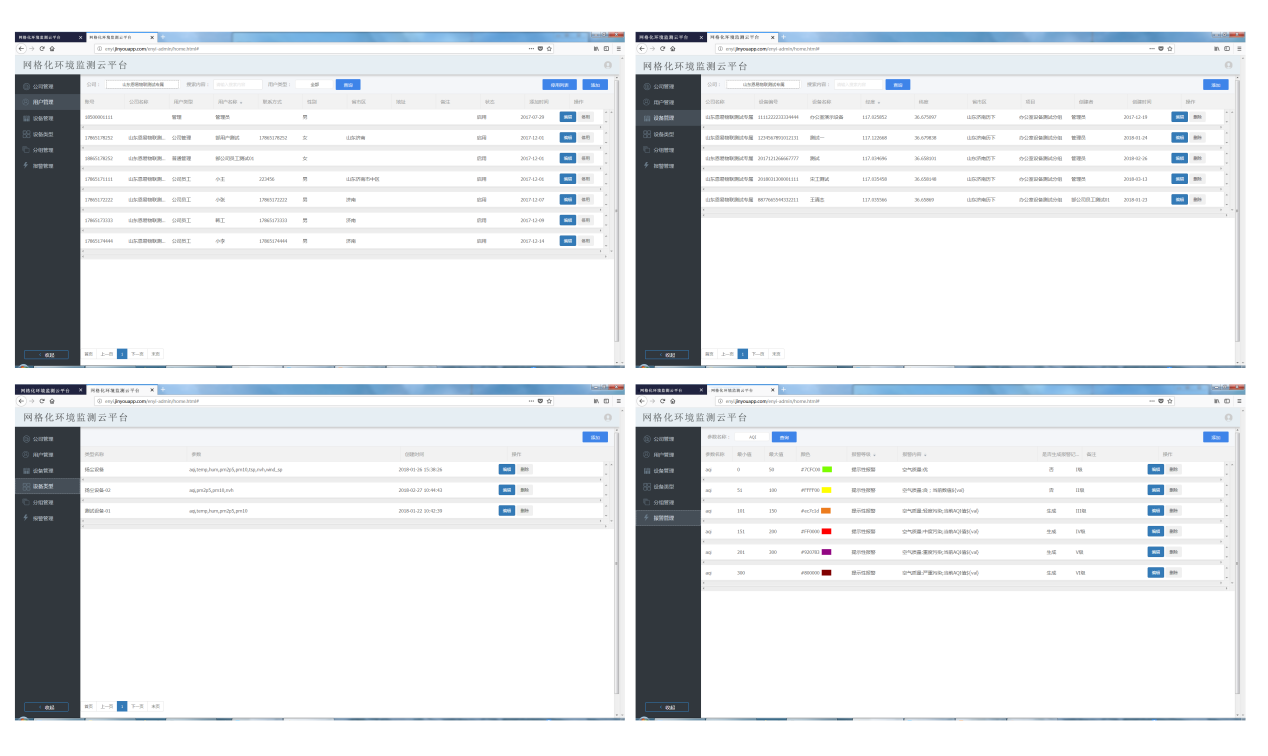 后台管理模块主要由公司管理、用户管理、设备管理、设备类型管理、分组管理和报警管理六部分组成。主要是对公司/单位、用户和设备账号的添加、编辑、删除和查询,通过对设备参数和设备分组设置,实现网格化区域部署的划分和管理,以及制定划分各环境参数污染报警等级,为报警等级列出标准,控制首页的污染等级展示内容。